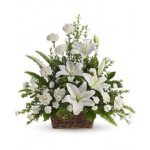 An all white basket is a very appropriate and thoughtful way to send your condolences. Rich in beautiful white flowers including white lilies, white carnations, and an assortment of greenery.