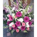 A gorgeous floor basket with lovely shades of pinks. Includes some white flowers to break up some of the pink, and fresh greenery. Each shade of flower compliments the next to make a beautiful basket arrangement. Appropriate for wakes and funeral services.