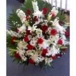 A simple yet elegant red and white floor basket that is handcrafted and designed with love and sympathy. Includes a fresh mix of flowers, greenery, and is appropriate for wakes and funeral services.