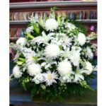 An elegant rich of all white mixed flower floor basket appropriate for the funeral home services. A great way to send your love and condolences.