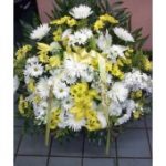 A beautiful white and yellow floor basket that is appropriate for the funeral home services. It includes fresh white spider mums, white and yellow daisies, yellow lilies, solidago, white stock and greens. Also includes bow, script on bow is optional. The item pictured is a depiction of a premium arrangement. If the exact flowers or container are unavailable, our designers will create a beautiful arrangement with the freshest flowers available.