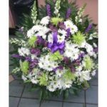 This lovely Sympathy Basket includes…green spider mums, white daisies, purple alstro, monte casino, white lilies, liatris, white snaps, with some greenery. The item pictured is a depiction of a premium arrangement. If the exact flowers or container are unavailable, our designers will create a beautiful arrangement with the freshest flowers available.