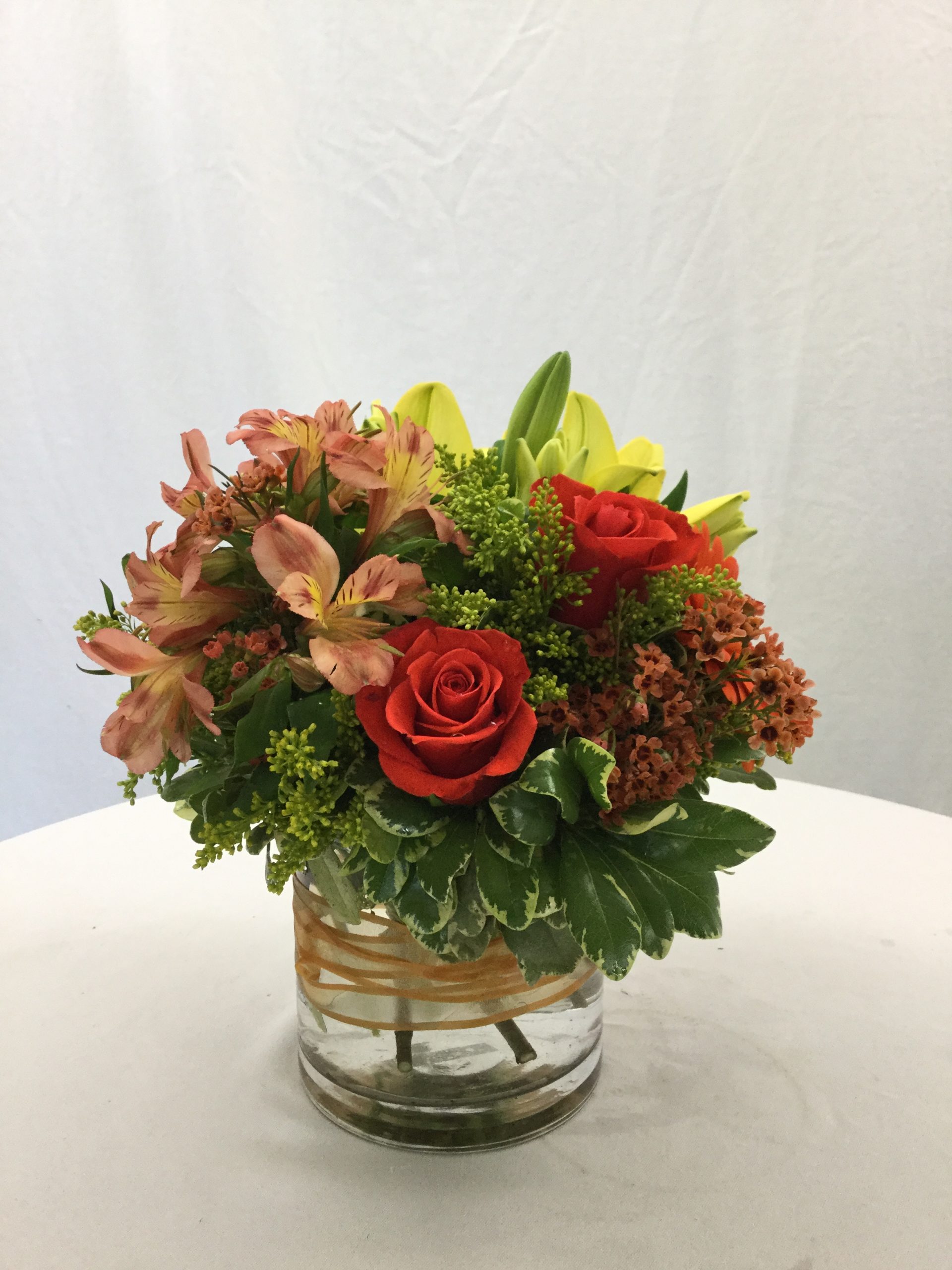 Including fresh autumn blooms, fresh greenery, and is hand-crafted and designed in a clear glass vase with a bow wrapped around.