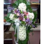 A gorgeous standing cross with a mixed flower swag. Includes lilies, roses, and more. An elegant cross, handcrafted and designed on a standing easel.