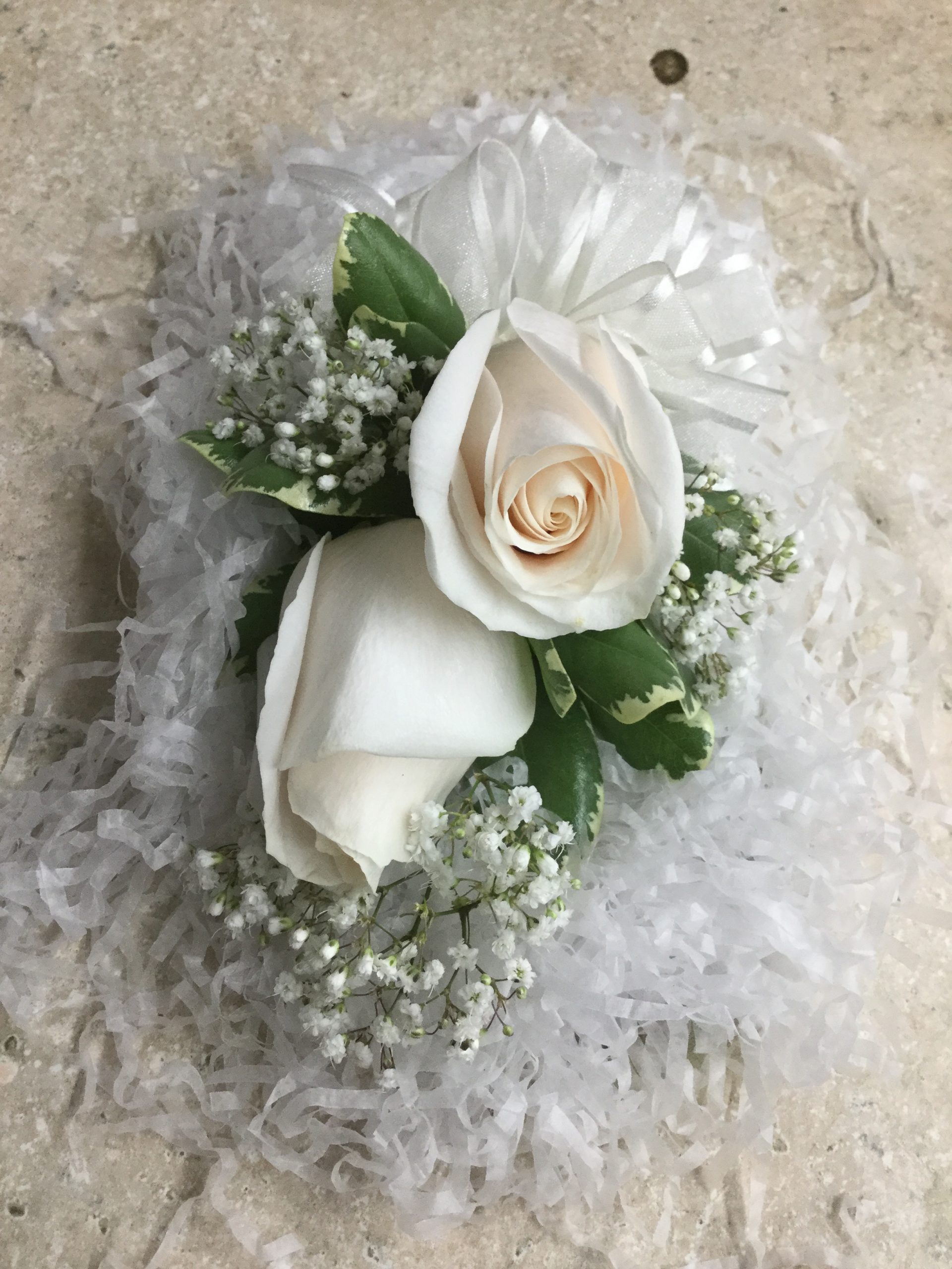 Stunning and elegant are just two of the words to describe this beautiful corsage. The white rose matches with every color dress.