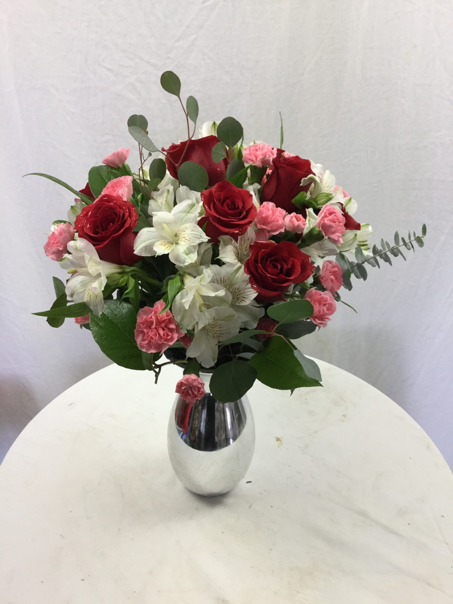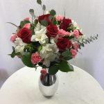 Includes a stunning silver vase, a mix of fresh blooms in shades of red and pink, and fresh greenery.