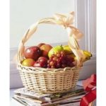 A lovely simple gesture, a terrific fruit basket full of fresh fruits in a wicker basket adorned with a beautiful ribbon.
