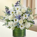 Includes a beautiful leaf wrapped cylinder vase, fresh white and blue blooms, and created with warmth and happiness.