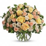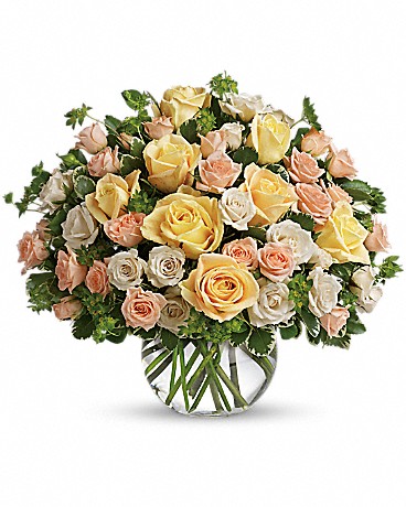 Includes a wonderful assortment of fresh roses, baby roses, and a beautiful clear glass bubble bowl vase.