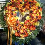 This stunning Autumn inspired standing open heart spray is hand-crafted and designed with love and sympathy. A gorgeous mix of Autumn flowers makes for a colorful, yet elegant tribute.