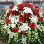 An elegant and tasteful red and white casket spray including roses that can be used for the wake and funeral services.