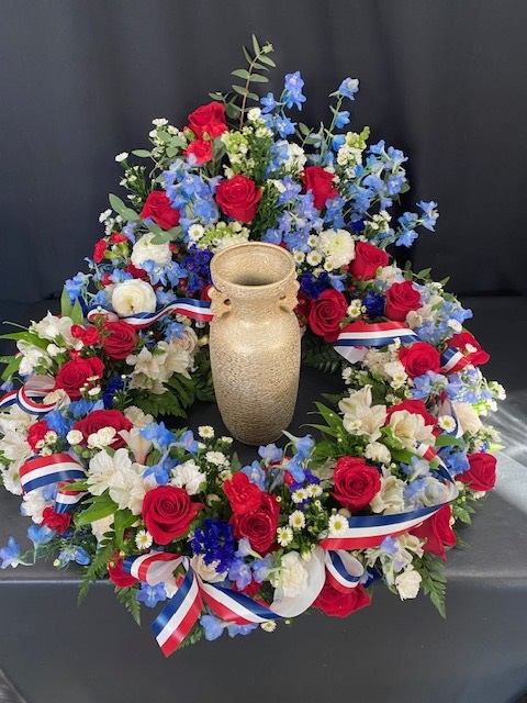 Includes fresh blooms in shades of red, white, and blue. A stunning and beautiful way to honor a loved one.