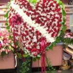 A wonderful and creative take on the broken heart tribute. It’s a closed heart with a sash of white roses. Includes red roses and baby breath to create the closed heart. Includes greenery and ribbons.