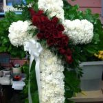 This elegant cross is hand-crafted and designed with carnations as a base, and has a red rose swag. Includes white bow. The item pictured is a depiction of a premium arrangement. If the exact flowers or container are unavailable, our designers will create a beautiful arrangement with the freshest flowers available.