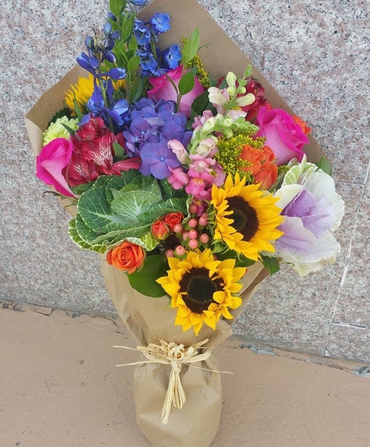 A gorgeous mix of fresh colorful blooms, hand-tied and wrapped with elegance in mind. This bouquet makes for a wonderful gift during every special occasion.