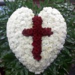 This stunning closed white heart with a red cross is designed into the piece, is an amazing way to show your love and support to the family and deceased. Beautiful white carnations create the white heart shape, and the red roses cross makes for a wonderful display. All hand-crafted and designed on a standing easel.